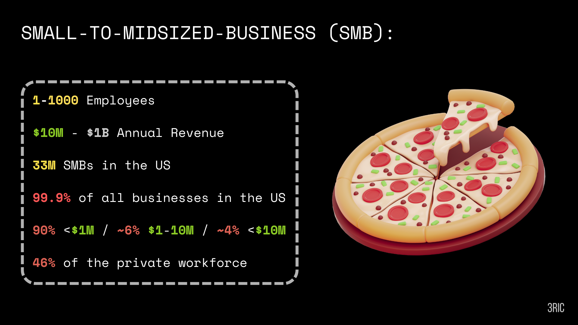 “SMB” is one of those terms that sounds precise until you look closer. By basic firmographics, SMBs range from 1 to 1,000 employees and anywhere from sub-$1M to $1B in annual revenue. That’s… not helpful. In reality, about 90% of U.S. SMBs make under $1M per year, and only ~4% clear $10M. Here’s the part that matters: 99.9% of U.S. businesses are SMBs, employing ~46% of the private workforce.
